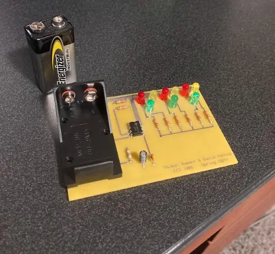 This is a PCB that a partner and I designed for our circuits class. The PCB sends voltage from the battery through the channels indented in the board. The resistors make sure that the LEDs are not subjected to too high of a voltage. To learn more about this project, click on the picture!
